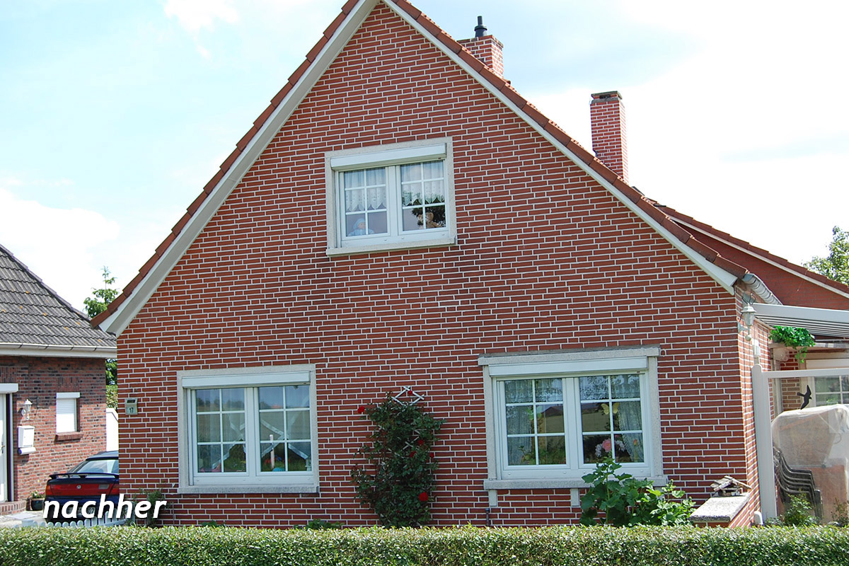 Auch bei Neubauten oder neuen Verblendungen zeigen sich häufig Schäden, wenn bei der Herstellung der Verblendung nicht mit der notwendigen handwerklichen Sorgfalt gearbeitet wurde. Schnell zeigen sich Fugenausbrüche, die sichtbaren Folgen eindringender Feuchtigkeit und Frosteinwirkung durch nicht ordnungsgemäß ausgekratzten Mauermörtel vor der Verfugung. Die Verfugung ist ganzflächig zu erneuern, da farbgleiche Fugen zwischen Alt- und Neuverfugung nicht zu erreichen sind. Besser Sie fragen gleich den Spezialisten.