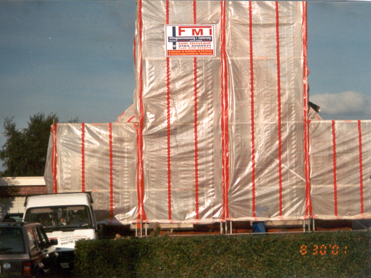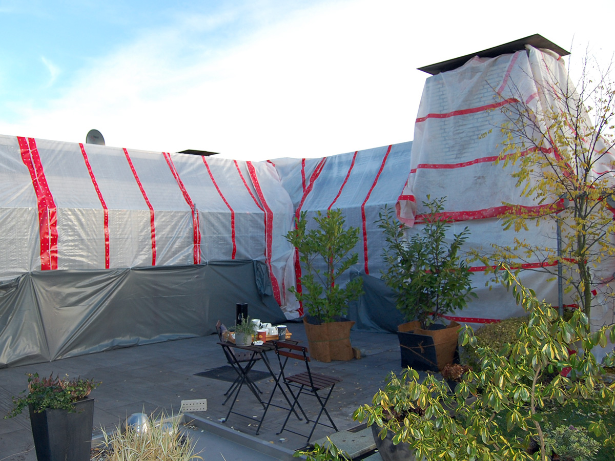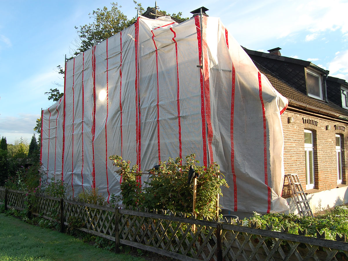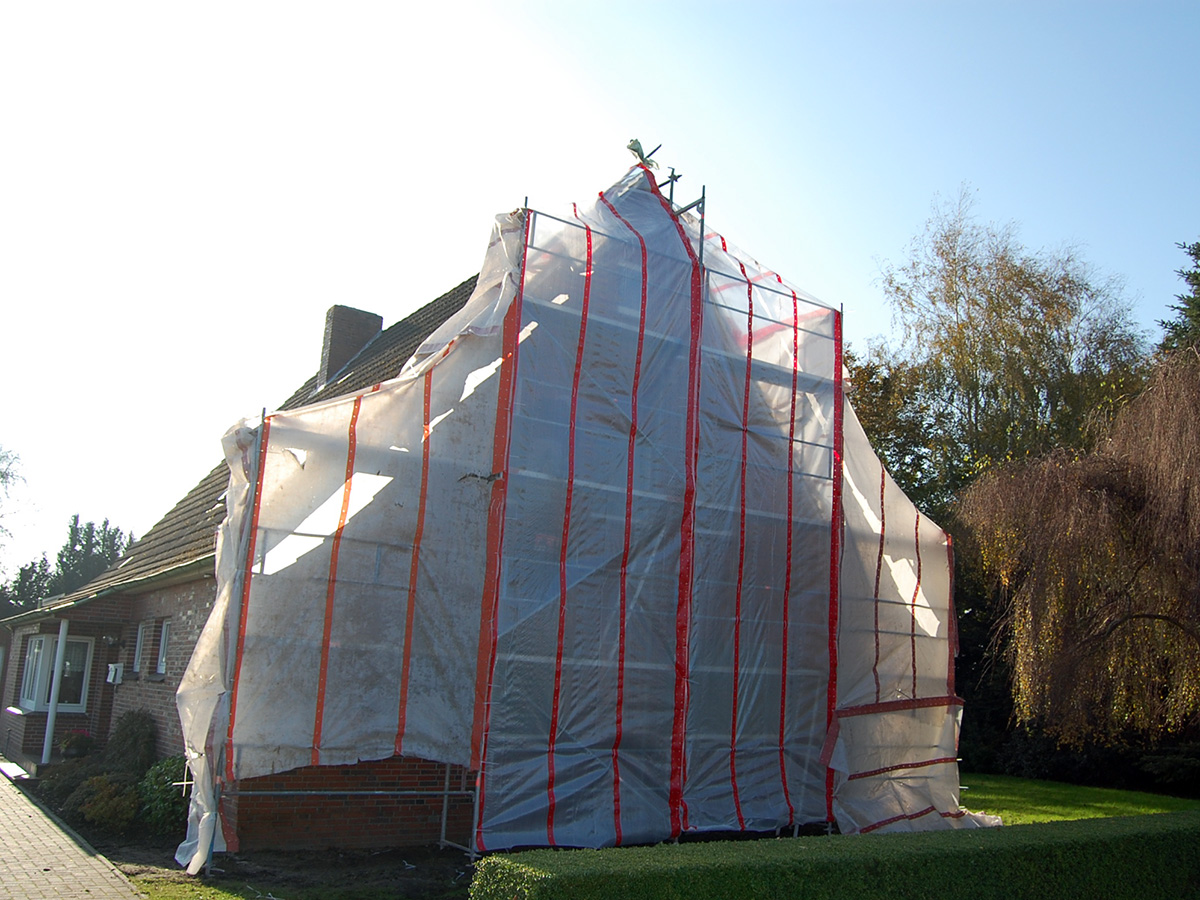 Wir arbeiten auf unseren Baustellen auf Wunsch oder je nach Erfordernis mit einem umfangreichen Staub- und Wetterschutz-System. Hierdurch wird das Gelände außerhalb des Arbeitsbereichs nicht verschmutzt und die Vorschriften des Umweltschutzes werden voll befriedigt. Da wir damit auch unabhängig vom Wetter unsere Arbeiten für Sie erledigen können, bieten wir Ihnen feste Ausführungstermine. Fragen Sie uns gerne nach den Möglichkeiten für Ihr Projekt.